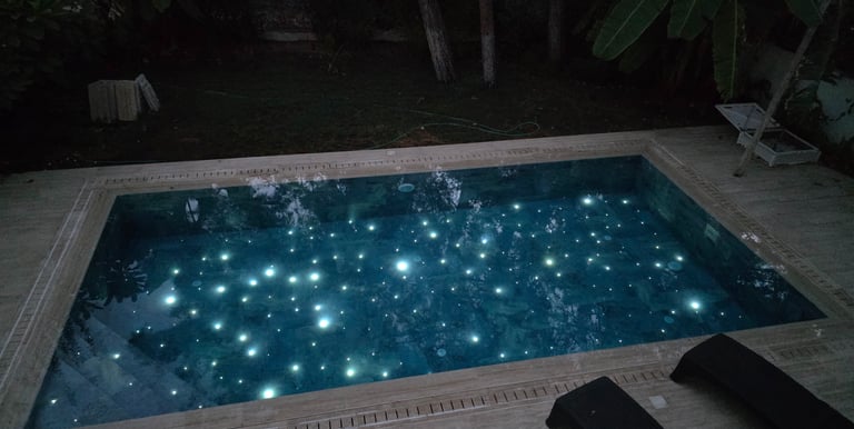 Elektrik Yok – %100 Güvenli Kullanım: Fiber optik kablolar yalnızca ışık taşır, elektrik iletmez. Bu da tam güvenli kullanım, su altında sıfır elektrik riski, bakım gerektirmeyen yapı ve çok uzun ömürlü performans anlamına gelir. Bu nedenle fiber optik aydınlatma, havuzlar için en güvenli teknolojilerden biridir.